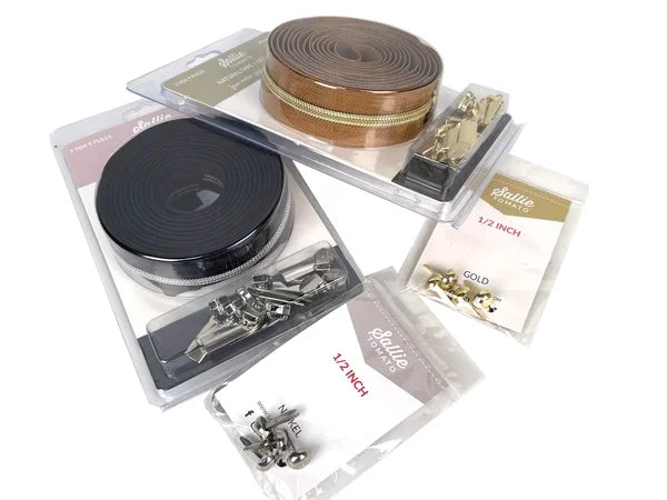 - Zippers: 3 yds natural zipper tape w/gold coils & 3 yds black zipper tape w/nickel coils